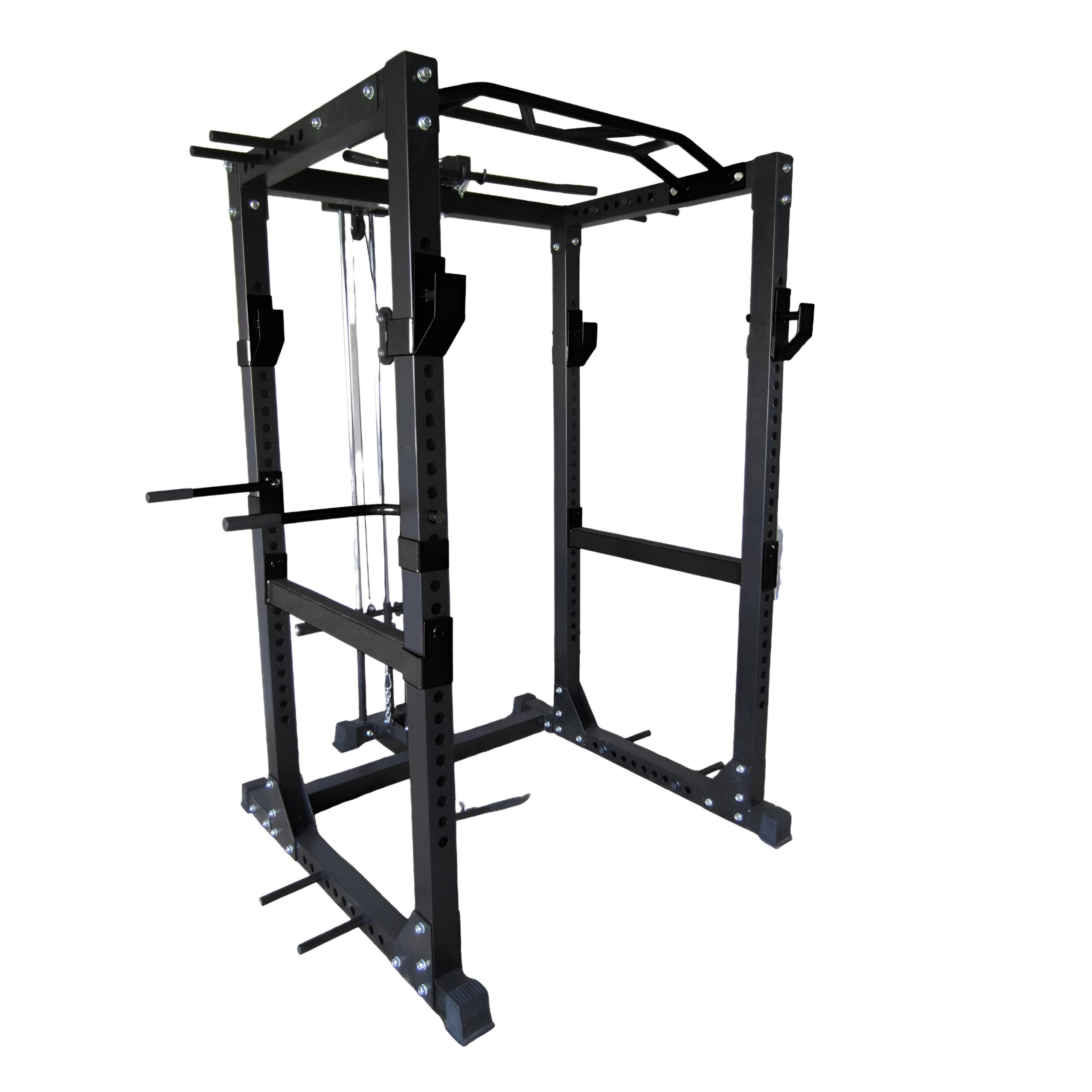 – Un **rack con polea alta y baja** que incluye **dips**, **zona de dominadas**, **agarre ancho**, **agarre corto**, **2 pares de jcups**, **safety bars** y **clavijas para enganche de bandas elásticas**. Este rack te permite realizar una gran variedad de ejercicios con diferentes niveles de dificultad, desde sentadillas, peso muerto, triceps en polea, hasta remo con polea entre otros.